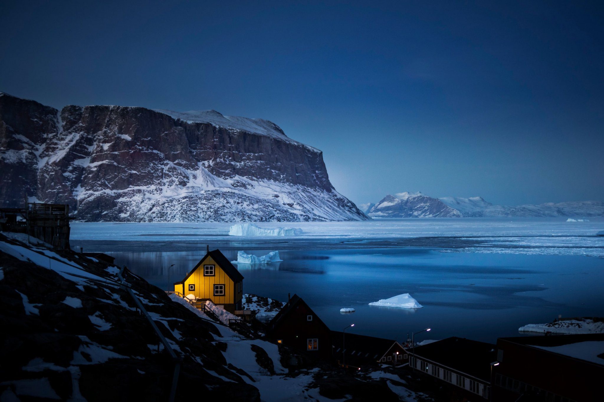 Der dicke Mantel der polaren Dunkelheit bedeckt die größten Teile Grönlands. Der Januar ist die Zeit des Wartens auf die Sonne. Seit Monaten geht die Sonne nicht auf, doch sind man die Nordlichter tanzen, die Sterne funkeln und den Mond, der sich im Schnee und in den Gewässern spiegelt.