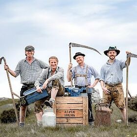 Toni Bartl ist ein Meister darin, den Rhythmus des alpinen Alltags in ein audiovisuelles Klangspektakel zu verpacken. Virtuos präsentieren seine Alpin Drums die gesamte Bandbreite der Percussion-Kunst. Als Weltmeister an der Steirischen Harmonika weiß der „Bergbauernbua“, wie man ein spektakuläres „Alpenglühen“ auf die Bühne zaubert: Die vier Profimusiker überraschen mit neuen Nummern, wobei die Highlights aus den ersten Programmen nicht fehlen dürfen. Gewöhnliche Utensilien des Bergalltags werden ideenreich und witzig zu Musikinstrumenten modifiziert. Da grooven Werkzeugkästen und Milchkannen zu klatschenden Händen, fliegen Messer in atemberaubendem Tempo auf ein Brotzeitbrettl, das nur Sekunden später als tönender Tischtennisschläger den Takt angibt. Akrobatisch geht es weiter mit einem mitreißenden Klopf-, Klepper- und Klappstuhltanz, dem ein virtuoses Solo auf Suppenlöffeln folgt. Und mit dem satten Sound von vier Holzfassln können selbst Kodotrommler kaum mithalten. Der Takt der Axt, das Rauschen der Sense, das Zischen des Melkens – das Leben in den Bergen ist Rhythmus pur.