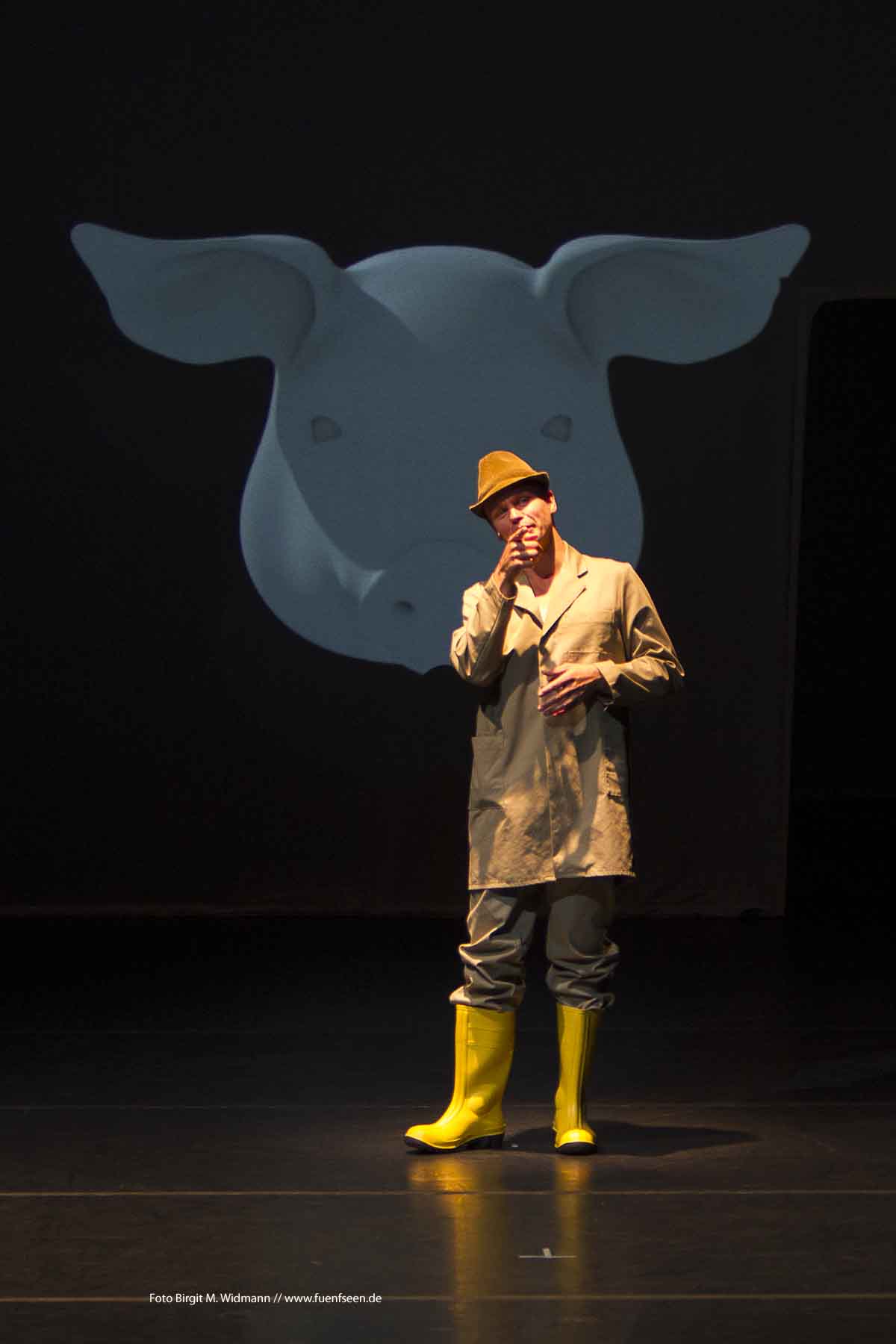 Abferkeln von Dustin Klein beleuchtet sachlich die heutige Fleischgewinnung in der Schweinezucht. Beginnend mit den Hintergründen der Besamung und „Einrichtung“ der Ferkel bringt Dustin Kleins das Publikum tänzerisch gekonnt den gesamten Prozess bis zur Wurstverwertung näher. Für mich war es auch eine Auseinandersetzung mit den heutigen Wertedruck. Was zählt mehr – Umsatz und Vorschriften oder ein Lebewesen mit seinen natürlichen Bedürfnissen und der menschlich intelligente Instinkt für richtiges Handeln? Im Eifer unserer täglichen Beschäftigung führen wir aus und schauen weg, wo wir eigentlich genauer hinterfragen sollten. Abferkeln weckt auf darüber nachzudenken, welche Geschichten hinter dem sauber in Plastik verpackten Fleisch stecken. Ich bin mir sicher, nach diesem Stück werden Sie mit anderem Bewusstsein um die Fleischtheke streichen. Ein wertvoller Beitrag für den Tierschutz. Ich hoffe, dass viele Menschen in den Genuss von „Abferkeln“ kommen.