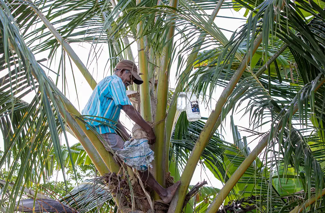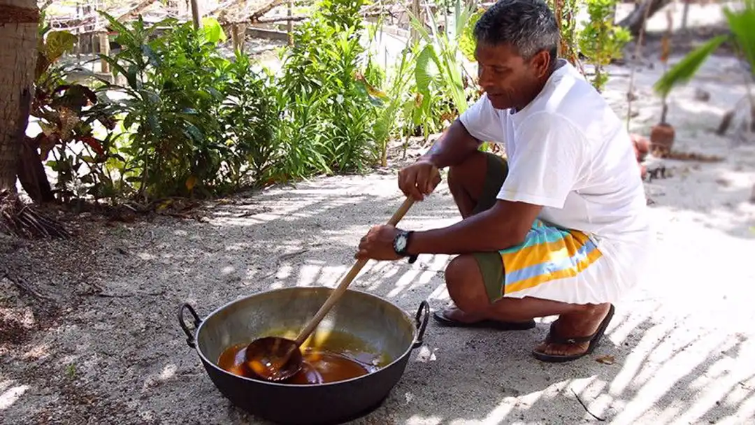 Ein weiteres Kapitel im Leben der Palme beginnt mit ihrer Blüte. Geschickte Raaveriyaa – die traditionellen „Toddy Tapper“, also erfahrene Palmensaft-Sammler – zapfen die Blütenknospen der Palme an, um den süßen Saft „Raa“ zu gewinnen: einen süßen, leicht fermentierenden Palmensaft, der frisch getrunken als Erfrischung dient oder eingekocht zu Dhiyaa Hakuru wird – einem karamellfarbenen Kokosblütenzucker mit intensivem Aroma. Gesammelt wird der wertvolle Saft in Raa Bandhi, kleinen Gefäßen – natürlich – aus Kokosnussschalen.