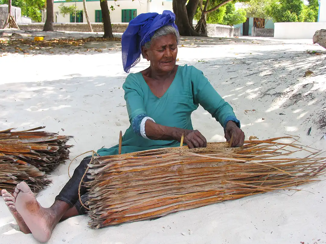 Auch die Palmwedel finden vielfältige Verwendung: getrocknet werden sie zu wetterfesten Dächern geflochten, zu Matten, Körben und Hüten verarbeitet oder kunstvoll in festlichen Zeremonien eingesetzt. Bei traditionellen Festen wie Eid, also dem islamischen Opferfest, oder bei den farbenfrohen Maali-Umzügen sind sie Teil der Dekoration und symbolisieren Beständigkeit und Zusammenhalt. Selbst in der zeitgenössischen Kunst wird das Material wiederentdeckt – als nachhaltige Hommage an ein Kulturgut, das auf den Malediven fest im Alltag verwurzelt ist.