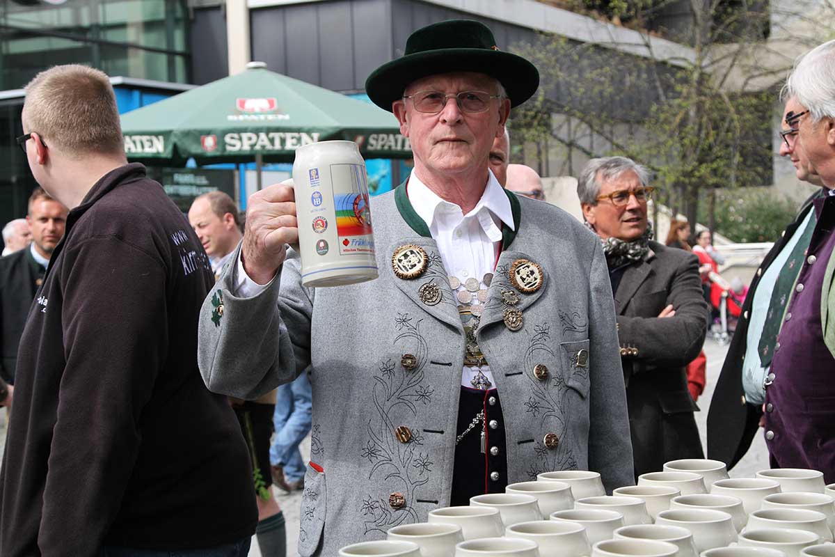 Der offizielle Frühlingsfestkrug, präsentiert von Frau Eleonore Höchtlen. Ihr Mann gestaltete den diesjährigen Krug, der Lebensfreude ausdrückt.