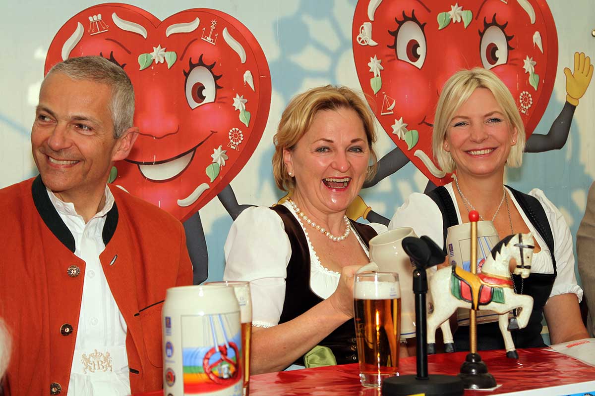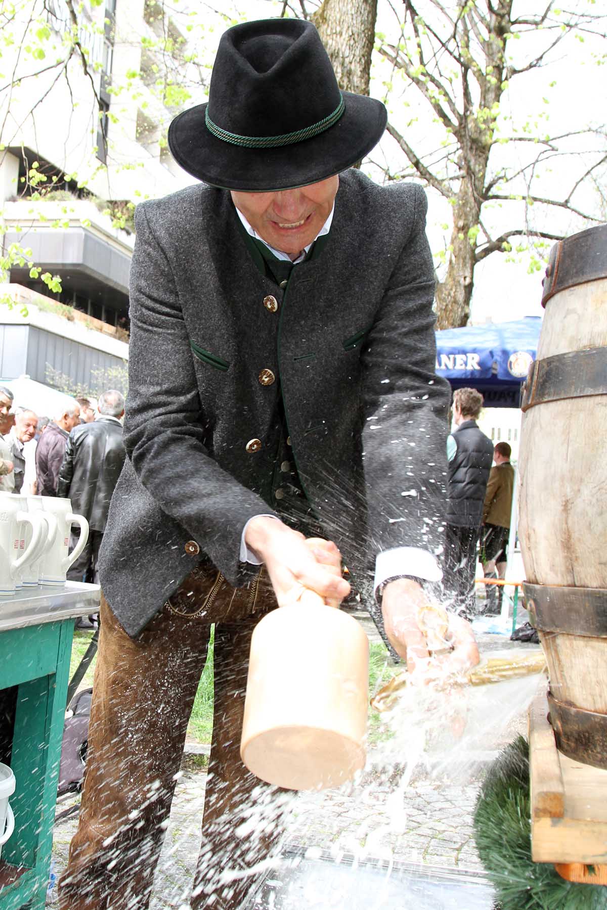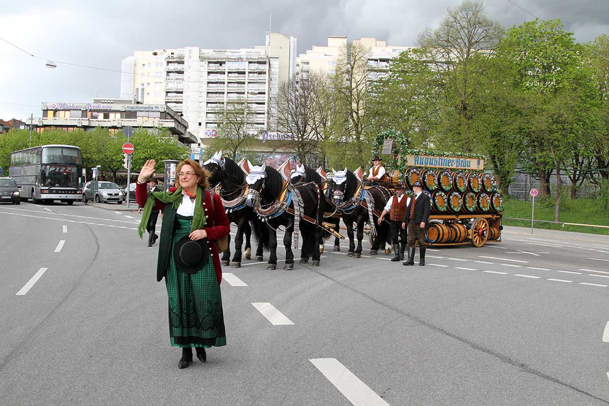 Los geht es am Zirkusspitz – mit Freibierausschank von 4 geschmückten Brauerreigespannen und festlichem Einzug zur Theresienwiese. Die Böllerschützen begrüßen die Gäste und der Festbieranstich wird von Wiesnstadtrat Georg Schlagbauer um 14.30 Uhr im Festzelt Tradition durchgeführt.