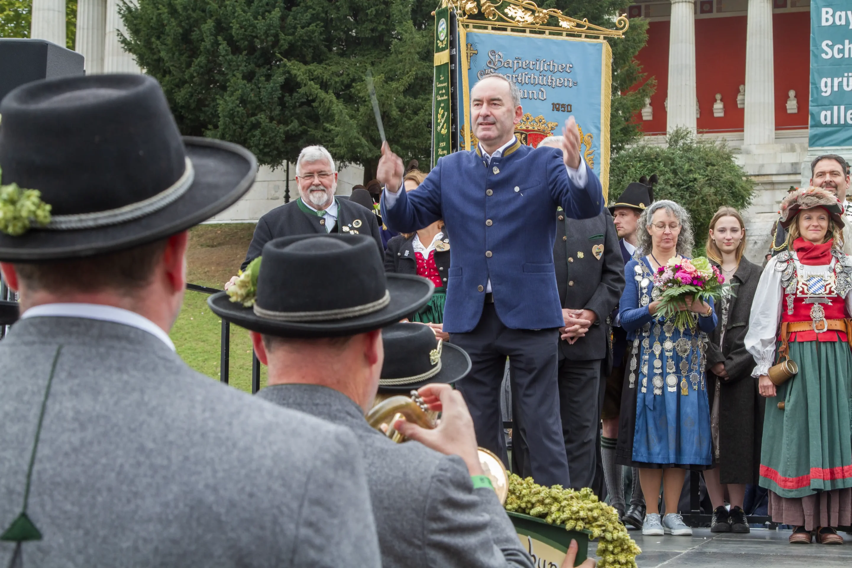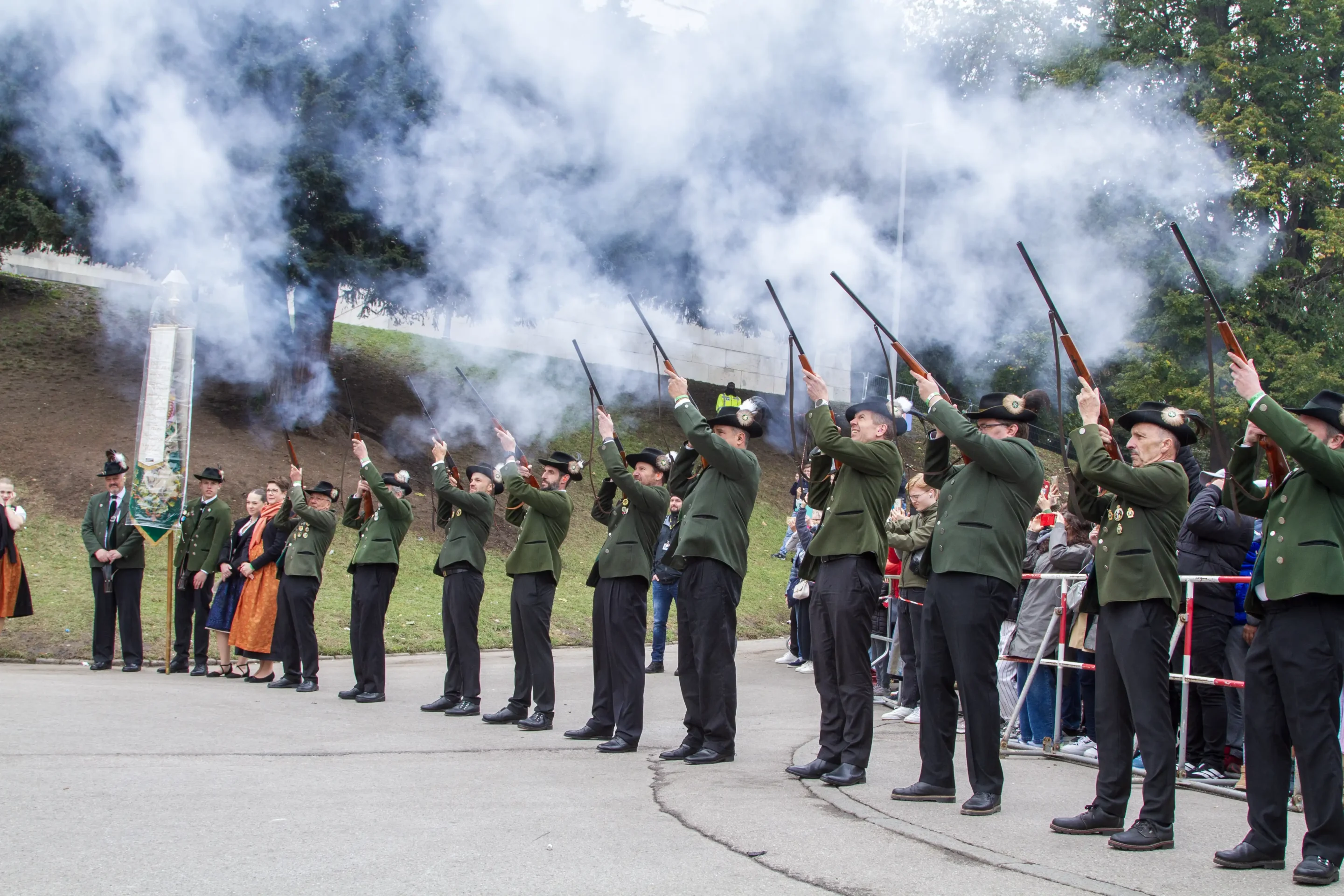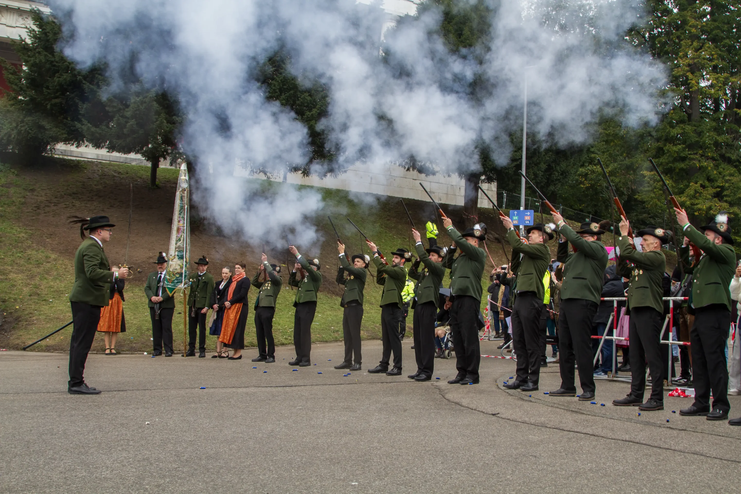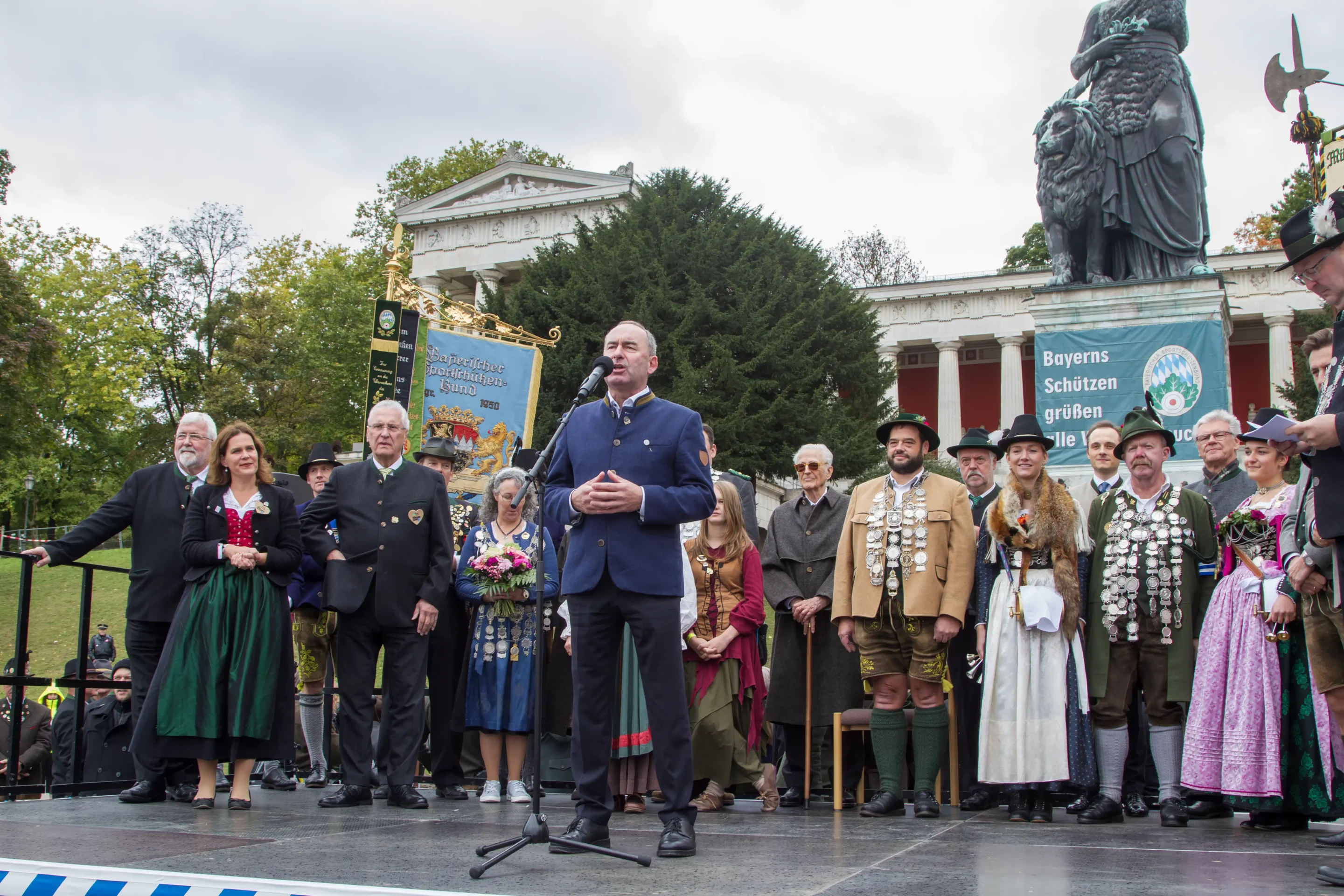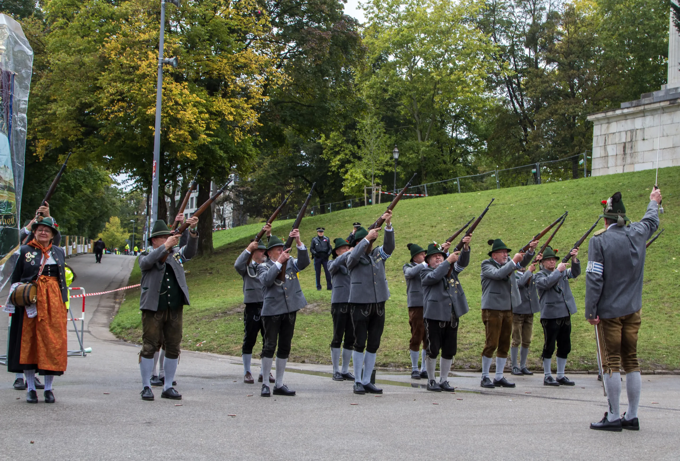 Rund 60 bayerische Schützen geben Salutschüsse ab und ehren ihre Sieger. Gleichzeitig verabschieden sie das Oktoberfest.