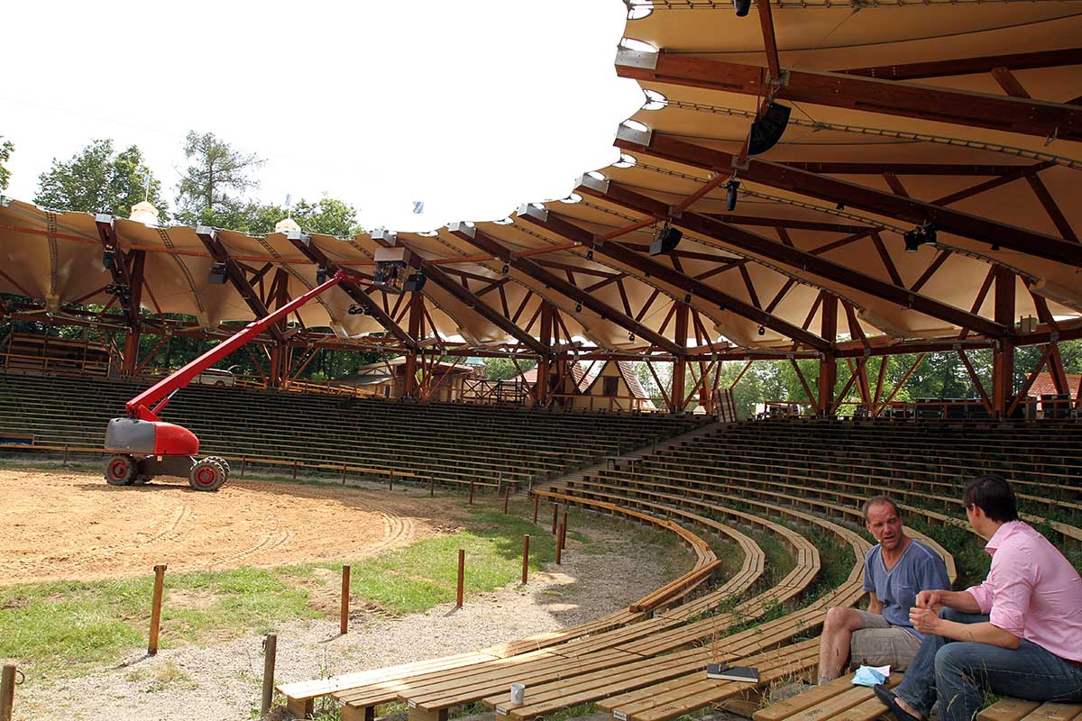 letzte Arbeiten am Dach der Arena der Kaltenberger Ritterspiele.